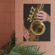 For the jazz music fan! Accent a living space with this acrylic art print that features the photographic image of a jazzman playing his time-worn, gold colored, tenor saxophone horn along with the word "JAZZ" printed in gold colored block letters. Customize your panel size as desired.