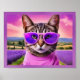 Poster with whimsical fantasy art. A jazzy cat in a trendy turtleneck and purple sunglasses stands against a backdrop of lavender field. Perfect for anyone who loves modern cats, humor, and early summer vibes. with whimsical fantasy art.