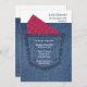 This stylish western party invitation features a blue jeans pocket background with a red bandana tucked inside. It's perfect for any western-themed celebration for children or adults. The card is easy to customize with your wording, font, font color and choice of six paper types.