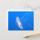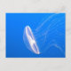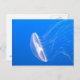 Translucent single jellyfish with tentacles flowing in a bright, clear blue sea.