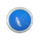 Translucent single jellyfish with tentacles flowing in a bright, clear blue sea.