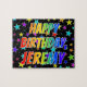 This exciting and vibrant birthday-themed jigsaw puzzle design has the message "HAPPY BIRTHDAY, JEREMY" with the characters having a colorful rainbow spectrum inspired gradient pattern, along with a fun field of stars background pattern. A colorful puzzle like this might be used to send a birthday greeting message to somebody named Jeremy. [~Z0000468]