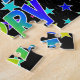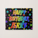 This vibrant, fun, birthday-themed jigsaw puzzle design has the message "HAPPY BIRTHDAY, JERRY" with the characters having a colorful rainbow spectrum inspired gradient pattern, in addition to a lively star field background pattern. A vibrant puzzle like this might be used to send birthday wishes to somebody named Jerry. [~Z0000468]