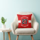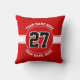 Jersey number, team and player name red and white sports throw pillow. It showcases the jersey number, the team and player names that can be changed on red background. There is a white and red band. Colors: red, white, black.