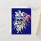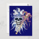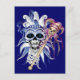 Mardi Gras style Jester skull is wearing New Orleans style mask in hues of blue and silvery white and holding a gold skull Jester scepter.