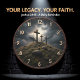 Bring a high-energy and powerful focal point of faith into your home with this realistic Calvary-themed wall clock. The central face features a high-definition graphic of three silhouette crosses atop a rocky, grass-covered hill under a dramatic, cloud-filled sky illuminated by a distant sunset glow. While the artwork masterfully mimics the textured depth of a natural landscape and the outer rim appears to be crafted from weathered, dark-stained timber, this is a lightweight and durable graphic timepiece rather than actual wood or stone. The elevated, golden-style numeric markers provide a professional and polished contrast against the atmospheric backdrop, ensuring the time is easy to read at a glance. This timepiece serves as a sophisticated addition to a study or living area, making it a perfect and meaningful self-gift for those who value high-quality spiritual art.