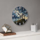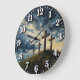 Incorporate a high-energy and moving declaration of faith into your home with this artistic Calvary-themed wall clock. The central face features a high-definition graphic of four crosses standing resolute on a grassy hilltop, rendered in a dramatic impasto oil painting style. The scene captures a sweeping, wind-swept sky filled with textured clouds in shades of deep blue and gold, illuminated by the light of a fading sunset. While the artwork masterfully mimics the thick, palette-knife texture of a physical painting and the wooden appearance of the crosses, this is a lightweight and durable graphic timepiece rather than actual canvas or timber. Large, crisp white numeric markers provide exceptional contrast against the expressive background, ensuring the time is professional and easy to read. This timepiece serves as a powerful focal point for any room, offering a meaningful self-gift for those who appreciate high-quality spiritual art.