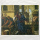 Vintage illustration religious design featuring Jesus Christ expelling the merchants and the money changers from the Temple. In this account, Jesus and his disciples travel to Jerusalem for Passover, where Jesus expels the merchants and money changers from the Temple, accusing them of turning the Temple into "a den of thieves" through their commercial activities.