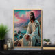 This captivating portrayal of Jesus by the ocean captures a serene moment of contemplation and divine connection. Seated on rocky terrain, He gazes thoughtfully at the horizon, where hues of pink and gold illuminate the sky. Clothed in flowing robes, His expression radiates peace and wisdom. The tranquil waters reflect a sense of calm, symbolizing spiritual renewal and hope. The blend of natural beauty and divine presence invites viewers to reflect on faith, peace, and the guidance Christ provides. This imagery stands as a timeless testament to His enduring love and compassion for humanity.