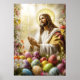 Stained Glass Art of Jesus Christ with a cute easter bunny and vibrant easter eggs. Cute rabbit animals for the resurrection of the christian religion. Happy Easter with the resurrection of Jesus.