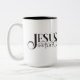 Coffee mug is shown in black and white with a Jesus is the way print.