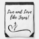 A drawstring bag featuring the phrase "Live & Love Like Jesus" on one side would likely have those words prominently displayed in an elegant or bold font, aiming to inspire or make a statement. The letters could be printed in a contrasting color to the bag itself for added emphasis. The reverse side of the bag would be plain, without any design or text, providing a simple and clean look. This minimalistic approach on one side and an inspirational phrase on the other makes the bag versatile for everyday use while also conveying a meaningful message.