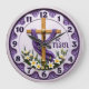 Celebrate the joy of the resurrection with this high-energy and beautifully artistic wall clock. The central face features a high-definition graphic of a wooden-style cross draped in a vibrant purple shroud, surrounded by fresh white lilies and the "he is risen" message. While the design masterfully mimics the appearance of a multi-layered, scalloped purple frame and a textured dial, this is a lightweight and durable graphic timepiece rather than actual wood or sculpted plaster. The bold purple numeric markers are set within circular white medallions, providing a professional and polished contrast that makes the time easy to read at a glance. This timepiece serves as an inspiring focal point for any kitchen, living area, or seasonal display, making it a meaningful self-gift for those who appreciate high-quality spiritual art.