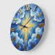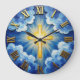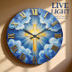 Transform your living space with a high-energy and radiant expression of faith. This striking wall clock features a high-definition graphic of a brilliant golden cross emanating a powerful sunburst from the center of a vibrant blue sky. Surrounding the divine light are stylized white and blue clouds, masterfully rendered to mimic the thick, textured appearance of an impasto oil painting. While the central cross and large Roman numerals look like raised, polished gold, this is a lightweight and durable graphic timepiece rather than actual cast metal or layered plaster. The bold gold-style numerals provide a professional and polished contrast against the deep blue background, ensuring the time is easy to read at a glance. This sophisticated timepiece serves as an inspiring focal point for any room, making it a meaningful self-gift for those who appreciate modern, high-quality spiritual art.