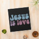 Blue, purple and pink vintage-style "Jesus is love" text design for Christians to spread the word about our Savior.