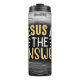 This powerful graphic boldly declares "JESUS IS THE ANSWER" in striking yellow and white typography. The text stands out against a dramatic grayscale landscape featuring layered mountains, dense evergreen forests, and a tranquil body of water. This stylized design conveys a profound spiritual message of unwavering faith and divine truth.