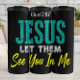This is a graphic design piece featuring a spiritual phrase in a three-color, multi-font layout. The text is set against a simple, light grey background. The phrase reads, "JESUS LET THEM See You In Me," with each line using a different font style and color. The word "JESUS" is a distressed turquoise, "LET THEM" is a white outline, and "See You In Me" is a yellow script. The overall aesthetic is modern and spiritual, suitable for a variety of inspirational products.