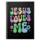 Christian Jesus Loves Me colorful letters and flowers quote notebook, with black background.