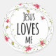 This Christian Sticker features a "Jesus Loves Me" quotes on a White Wreath Floral background.