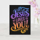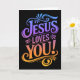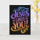 This bold and uplifting design features the message “Jesus Loves You!” in striking, vintage-inspired typography. Set against a deep black background, the lettering comes alive with a vibrant gradient that flows from cool blues and purples at the top to warm oranges and golden yellows at the bottom. Elegant flourishes and decorative swirls add a classic, handcrafted feel, while the strong contrast and radiant color give the piece a modern, eye-catching energy. The overall design is both timeless and joyful—perfect for sharing encouragement, faith, and positivity.