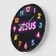 Infuse your space with a vibrant, high-energy declaration of faith with this modern Jesus wall clock. The central face features a high-definition graphic of the name "JESUS" in a brilliant neon-style pink glow, surrounded by dynamic multi-colored paint splatters that appear to burst off the dark dial. While the artwork masterfully mimics the appearance of luminous neon tubing and 3D liquid droplets in shades of electric blue, yellow, and orange, this is a lightweight and durable graphic timepiece rather than actual neon lights or wet paint. The large, glowing-style numeric markers provide exceptional contrast against the deep black background, ensuring the time is easily readable in any lighting. This professional timepiece serves as a bold focal point for a bedroom, studio, or modern living area, making it an inspiring self-gift for those who appreciate contemporary spiritual art.