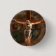 Jesus on the cross button has a wooded cross with Jesus hanging from it and a brown back ground