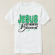 This white t-shirt features a vibrant and uplifting design. The name "JESUS" is prominently displayed in a large, green, slightly distressed font with a black outline. Below it, the phrase "PAID IT ALL" is written in a smaller, black, sans-serif font. Underneath that, the word "Blessed" is presented in an elegant, flowing black script. Small green crosses and starbursts accent the design. This shirt powerfully conveys a message of salvation and divine favor.