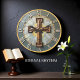 Elevate your home decor with a high-energy expression of faith using this rustic abstract wall clock. The central face features a high-definition graphic of a weathered, golden-brown cross set against a radiant sunburst and a muted sage-green background. While the artwork masterfully mimics the thick, heavy-stroke appearance of a palette-knife oil painting and the central cross looks like aged, hand-carved timber, this is a lightweight and durable graphic timepiece rather than actual wood or layered plaster. The bold, off-white Roman numerals are set against a distressed-style outer rim, providing a professional and polished contrast that makes the time easy to read. This timepiece serves as a sophisticated focal point for a living room, office, or prayer space, offering a meaningful self-gift for those who appreciate high-quality spiritual art with a modern, rustic aesthetic.