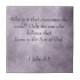 This ceramic tile features a scripture about Jesus in black with an amazing gray background. "Who is it that overcomes the world? Only the one who believes that Jesus is the Son of God." 1 John 5:5.