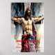 A muscular figure, presumably representing Jesus Christ, crucified on a wooden cross. He has long, flowing hair and is shirtless, revealing a chiseled physique. Draped around his waist is a piece of cloth, possibly a loincloth. His arms are outstretched, holding onto the cross's wooden beams. Chains hang down from the cross, and there are droplets of blood and water around him. The background is abstract, with a mix of dark and light hues, possibly representing the sky or a tumultuous atmosphere.