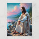 This serene portrayal of Jesus captures a tranquil moment of contemplation by a peaceful coastline. Clothed in flowing robes, He sits thoughtfully on rocky terrain, gazing at the vibrant horizon painted with hues of pink and gold. The gentle waves and rugged landscape create a harmonious backdrop, symbolizing both strength and serenity. His expression radiates wisdom and compassion, inviting viewers to reflect on faith, peace, and the beauty of divine creation. This imagery serves as a timeless reminder of Christ's role as a source of comfort, guidance, and spiritual renewal for all who seek His presence.