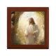 Trinket box is shown in golden oak wood with an art print of Jesus at resurrection.