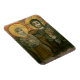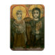 An image from the 6th or 7th century. Artwork on a gold background depicting Christ holding a large Bible. The Savior and Abbot/Monk have large brown eyes.