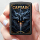 This commanding metal lighter features a sleek, dark fighter jet soaring toward the viewer through a turbulent, midnight-blue thunderstorm. The aircraft is perfectly centered, its powerful silhouette emphasized by the bolts of white lightning that strike from the dark, sculpted clouds above. The jet's engines leave a fiery, golden-orange trail below. The massive, golden title "CAPTAIN" is boldly positioned at the top, framed by ornate gold scrollwork, with the name "Alexander" anchoring the base. This striking, personalized gift is ideal for a pilot or commander who demonstrates courageous and decisive leadership in extreme, high-stakes weather.