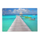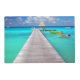 Placemat with a wooden jetty with some colorful boats and a thatched hut in the turquoise blue lagoon of the tropical, Pacific island Rangiroa, close to Tahiti and Bora Bora in French Polynesia.