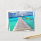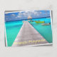Postcard of a wooden jetty with some colorful boats and a thatched hut in the turquoise blue lagoon of the tropical, Pacific island Rangiroa, close to Tahiti and Bora Bora in French Polynesia with a white edge and in yellow the text 'French Polynesia'. The image is a bit rotated to create the illusion of it laying loose.