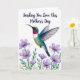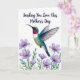 Designed with a jewel-toned bird hovering mid-flight over a white background, the scene feels like a quiet love note in nature ❤️. The bird’s throat shines ruby red, blending into emerald across its back and deep teal along the tail, with small white touches on the belly and under the wings. Its wings stretch wide with soft, airy brushwork that suggests a quick flutter, like it’s pausing for someone it trusts. Beneath it, a garden of stylized flowers spreads out, with lavender petals and sunny yellow centers nestled among fresh green leaves 🌼. The gentle spacing between bird and blossoms creates a tender “reaching toward you” moment, as if the bird is drifting closer to an unseen companion. A short message sits at the top in a flowing letter style, set in a dark, easy-to-read color against the bright background. Below, the floral cluster gathers near the bottom edge, with the lavender blooms and green foliage framing the bird’s flight path.