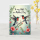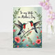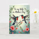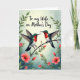 This design shows two jewel-toned birds at the center, with emerald-green on their heads and backs, a ruby-red throat, and a bright white breast. One bird hovers midair with wings stretched wide while the other rests on a thin branch, their narrow beaks angled toward each other as if sharing a quiet, affectionate moment ❤️. Around them, leafy green plants curl in close with coral-pink flowers and small buds that soften the scene. The background fades from a pale yellow-green near the top into a calm teal-blue lower down, like gentle morning light. Near the top, the message “To my Wife on Mother’s Day” sits above the illustration in flowing dark lettering that stands out against the lighter backdrop. The birds’ glossy color shifts and the soft, layered paint texture give the picture a tender, close-knit feel without needing extra decoration 🌼. Coral-pink blossoms dot the sides and lower edges, with green leaves framing the pair like a natural border.