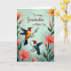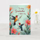 Designed with two slender-billed birds as the main focus, the artwork shows them perched on a budding branch with a gentle, affectionate closeness ❤️. The upper bird has an olive-green head, a red throat, and an orange-yellow body, with its wings slightly spread as if pausing mid-hover. Below it, the second bird mirrors the pose with a deep teal body, a bright red throat, and a green head, angled upward as though sharing a quiet moment. Around them, large open flowers in coral and soft tangerine bloom alongside smaller buds, their golden stamens standing out against layered green leaves 🌼. The background is a soft pastel teal with a light texture that adds calm depth without distracting from the birds. Near the top center, the message “To a loving Grandmother on Mother’s Day” appears in a flowing, elegant style, set in a darker teal that stays readable against the pale backdrop. The floral border curls inward from the sides, with warm blossoms and fresh green foliage framing the birds against the teal field.
