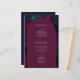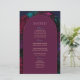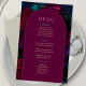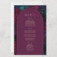 A refined jewel tone floral wedding menu showcasing burgundy, dark plum, and emerald green flowers set against a deep blue background. The moody dark palette gives a romantic gothic mood while the modern botanical artwork adds elegance to reception tables. This richly colored design complements dramatic evening celebrations and creates a sophisticated dining experience for guests.