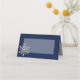 Elegant dark blue folded place card with graphics of a silver framed text area and a silver tone and jewel snowflake bauble, on the front. Personalize the custom text, on the back of the card to read what you want. Personalize the front of each card, by hand, for your wedding reception.