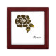This product is made with beautiful mahogany wood, the inside is lined with white satin. The hinges are very sturdy and keeps a tight close on the box. The pattern tile is wonderful It's truly is an exquisite product. This is a gift for anyone and for any occasion. A fine wooden piece to display on your furniture anywhere in your home. The printing accented the design on the box very well. Very pleased with the Font.