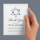 Extend a heartfelt thank you during your hardest moments with a bespoke Jewish funeral thank you note. Nestled on a sleek, flat invitation card, this token of gratitude features a pure white backdrop with dual lined border, complemented by a delicately designed Blue Floral Star of David. Personalize your message to express your appreciation, providing an intimate touch during a time of bereavement.