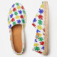 This design features a jigsaw puzzle piece pattern in bright red, yellow, green, and blue, printed on canvas Afridrilles shoes. The shoes are handmade in Kenya and available in both men's and women's sizes.