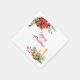 These pretty Christmas paper napkins will brighten up your Holiday table! At the top left corner is a red poinsettia, gold bells, and pine needle bouquet. At the bottom right is an image of two burning candles with gold jingle bells, holly sprig, and red berries embellishment. At the center is red script that says "Merry Christmas" Everything is placed on a white background. Elegant!