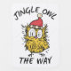 Funny and crazy looking owl wearing a Santa hat and the quote "Jingle owl the way". A cool and funny kind to celebrate Christmas eve.