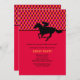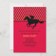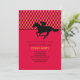 A sporty invitation that's perfect for a Kentucky Derby party or any horse-racing-related occasion. The card features a red, orange and black argyle pattern on top, a solid red bottom and a silhouette jockey on a horse in black.