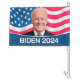 This design a picture Joe Biden with an American Flag waving in the background. A 2024 campaign car flag with very traditional features and icons. Classic fonts are used to make this a popular and traditional design for this election. He is running in the 2024 election in the Democrat Primary.