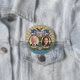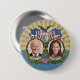 A vintage campaign button design with photos and gold and blue accents. The intricate design includes an eagle and American flags and other details.