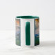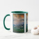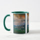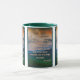 This two-tone mug showcases a bold kavoon print font with silver letters gold outline with the "Joel 2:1" KJV bible quote scripture featuring a background picture of a jungle full of green trees with mountain ranges throughout under a cloudy sky with darker colors in this bible quote theme from the King James bible. The rim & handle are glazed in matching colors available in 11-ounce or 15-ounce sizes microwave and dishwasher safe ceramic construction.